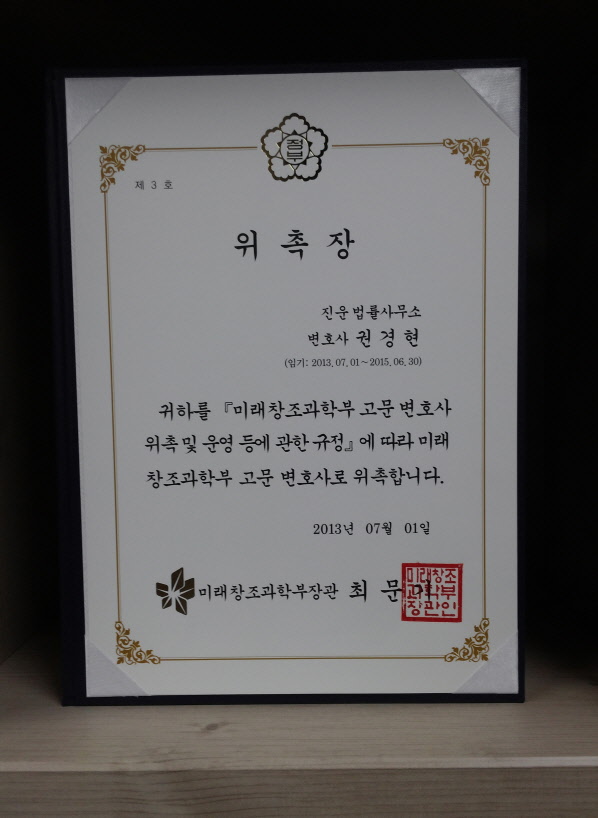 권경현 대표변호사가 미래창조과학부 고문 변호사로 위촉되셨습니다. 위촉기간은 2013년 7월 1일부터 2015년 6월 30일까지로, 위 기간 동안 권경현 대표변호사는 과학기술방송통신 업무 전반에 걸친 법률 자문 등의 직무를 수행하실 예정입니다. 진운은 미래창조과학부와 함께 과학기술정책과 정보통신기술 발전을 위해 노력하겠습니다. 감사합니다.