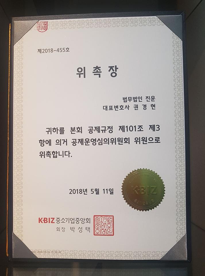 2018. 05. 법무법인 진운 권경현 대표변호사가 중소기업중앙회 보증공제기금 공제운영심의위원회 위원으로 위촉되었습니다. 중소기업협동조합법상 보증공제기금은 입찰보증이나 계약이행증권 발급시 중소기업 및 중소기업협동조합의 공공조달 참여를 지원하는 정책입니다. 법무법인 진운은 중소기업 분야 및 공공조달에 대해 중소기업을 위한 실질적인 도움이 될 수 있는 법률, 정책 지원 서비스를 제공하도록 노력하겠습니다.