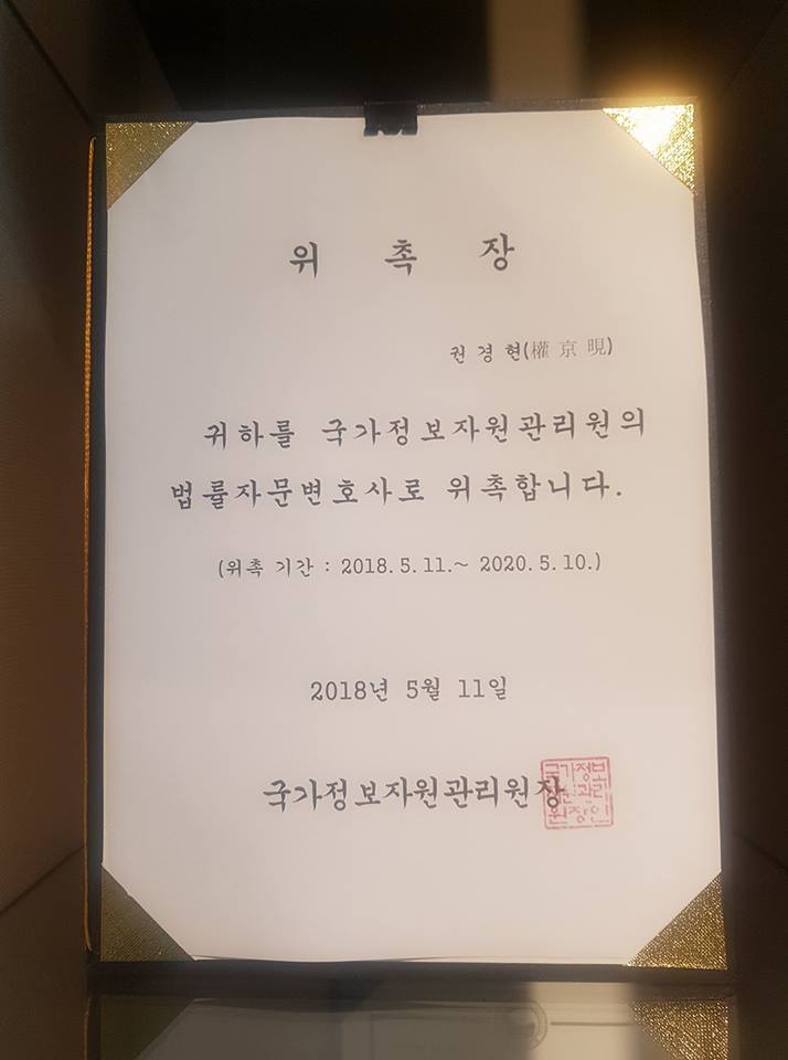 국가정보자원관리원 법률자문변호사로 재위촉되었습니다.