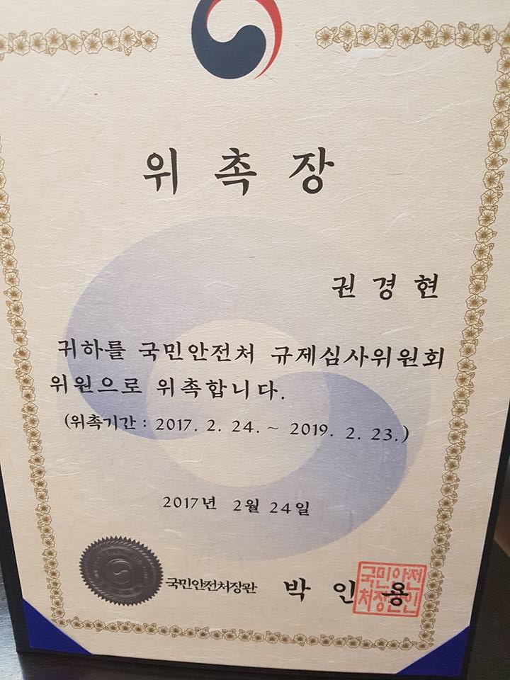 세월호 이후 국민안전처가 출범하며 2015년 규제심사위원으로 참여한 이래 국민안전처 규제심사위원활동으로 국민안전 분야에 대해 적극적으로 심사한 공적과 노력을 인정받아 2015년 국민안전처장관 표창을 수상한 바 있고, 2017년 규제심사위원으로 재위촉되었습니다.