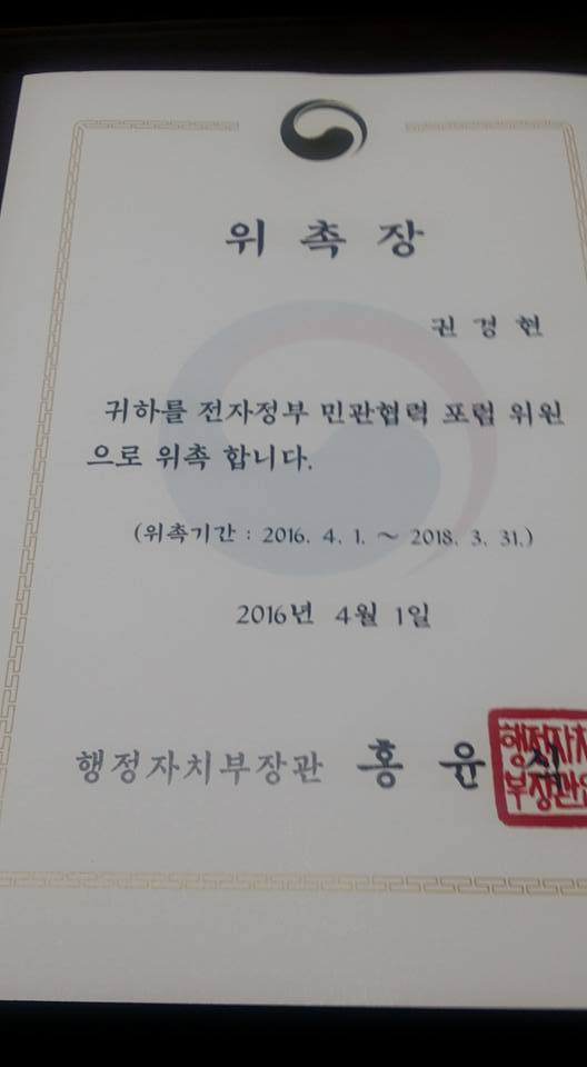행정자치부 전자정부 민관협력포럼 위원으로 위촉되었습니다.