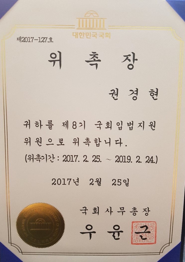 2017.3월 우윤근 국회 사무총장 주재 제8기 국회입법지원 위촉식 겸 국회 입법지원단 회의가 있었습니다.