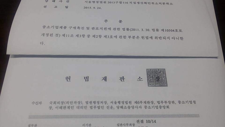 2013헌바393 결정에서 중소기업청, 중소기업중앙회를 대리하여