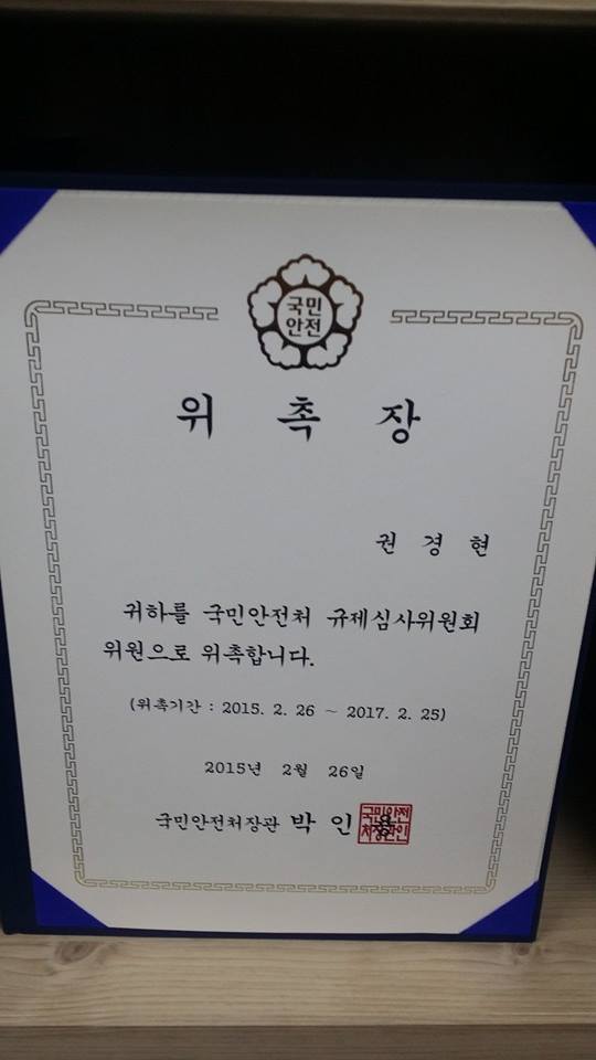 국민안전처 규제심사위원회 심의위원으로 위촉되었습니다.