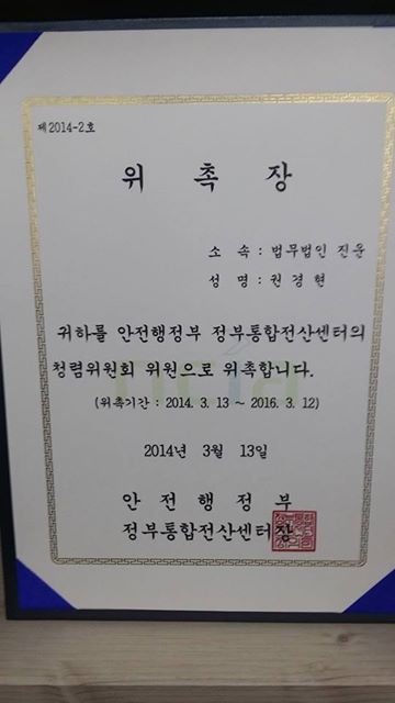 안전행정부 정부통합전산센터 청렴위원회 위원(2014.3.13-2016.3.12)으로  위촉되었습니다.