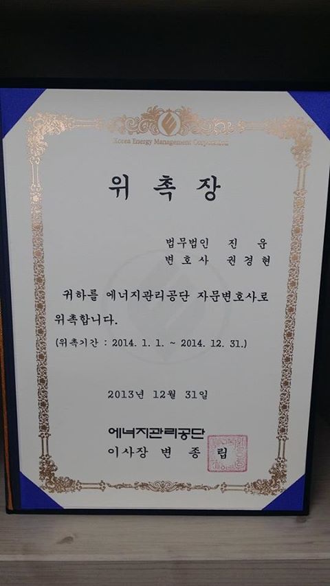 법률고문으로 위촉되어 에너지관리공단 신재생에너지 분야 법률자문 업무를 수행합니다.