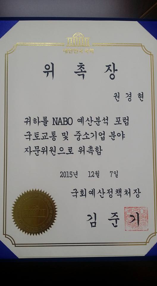 2015. 12. 국회 예산정책처 예산분석포럼 국토교통 및 중소기업 자문위원 위촉