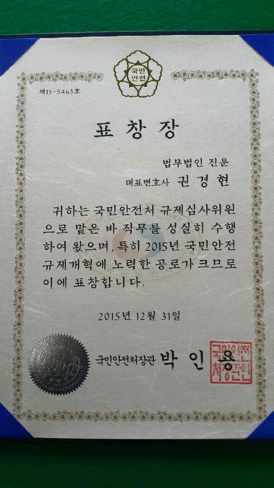 법무법인 진운 권경현 대표변호사가 국민안전처 규제개혁심사위원회 규제심사위원으로 직무를 성실히 수행하여
