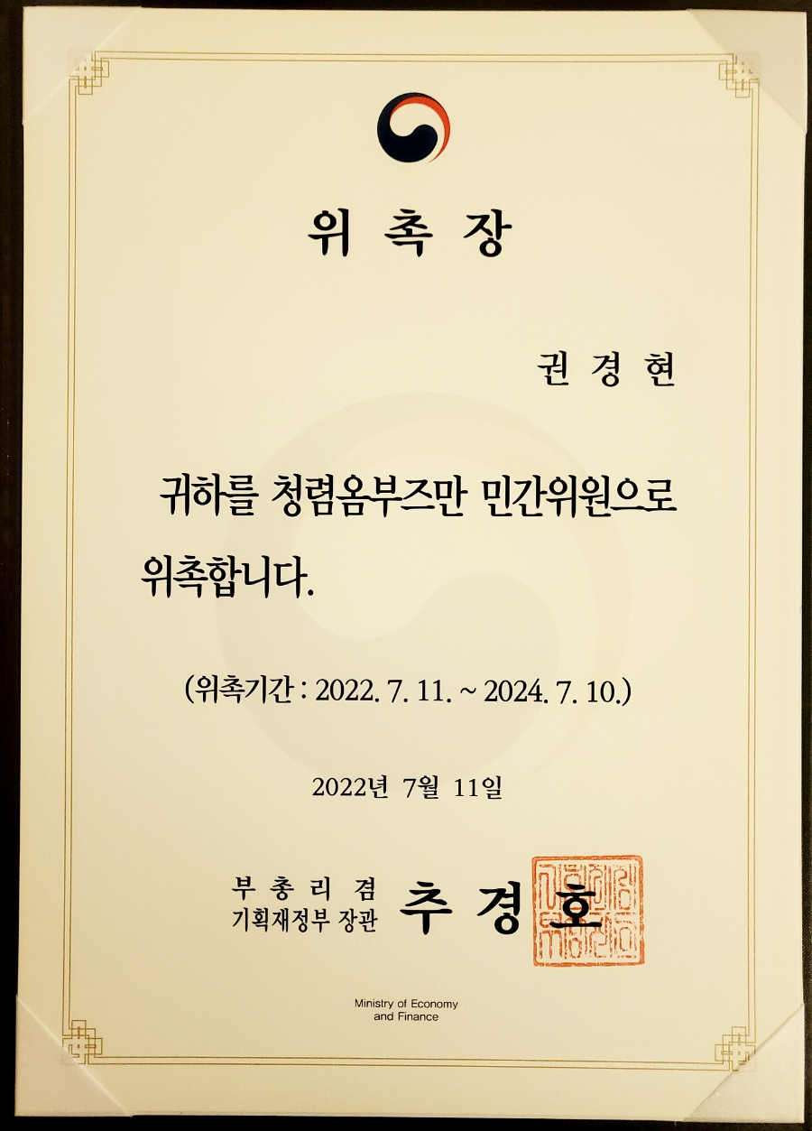 2022. 07. 기획재정부 청렴옴부즈만 민간위원 위촉