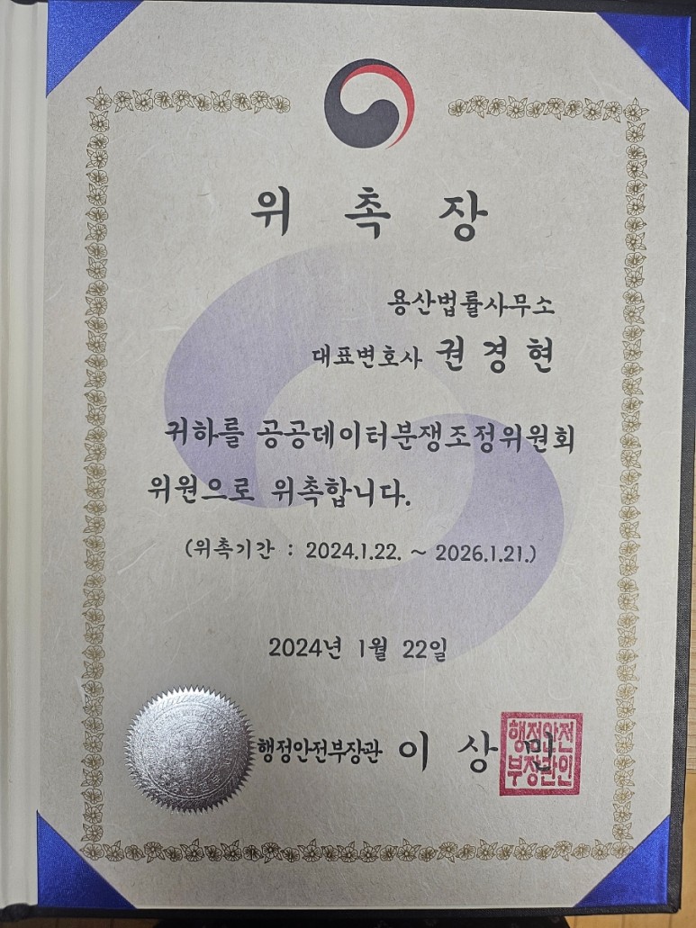 용산법률 권경현 대표변호사가 공공데이터분쟁조정위원회 위원으로 위촉되었습니다.