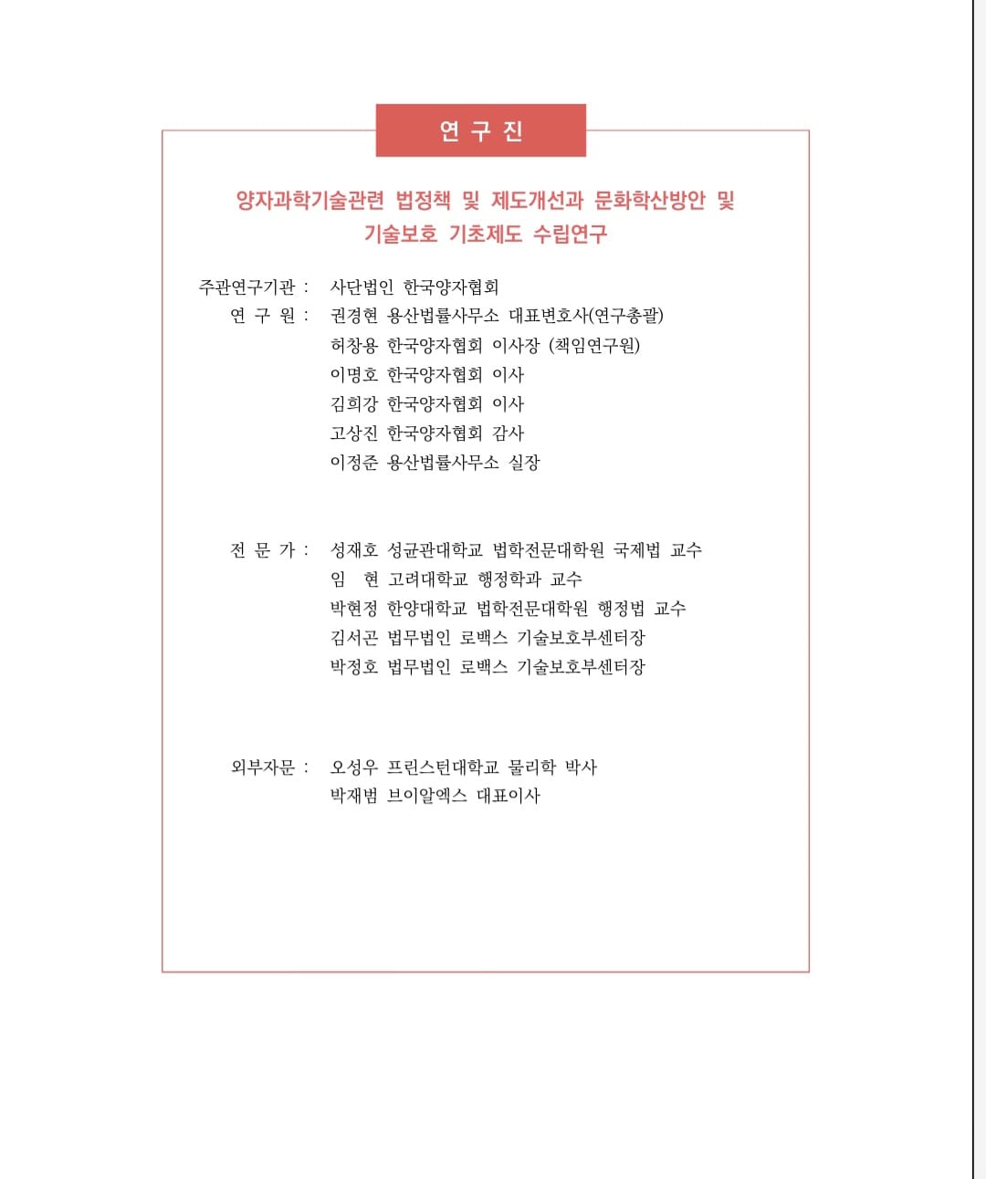 양자과학기술 관련 법정책 및 제도개선과 문화확산 방안 및 기술보호 기초제도 수립 연구 (2023)를 수행하였습니다.